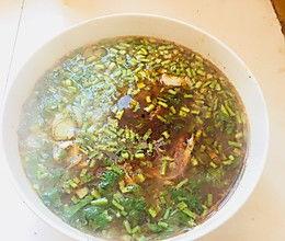 6. 将熬好的汤底倒入碗中,撒上葱花、香菜等配料。